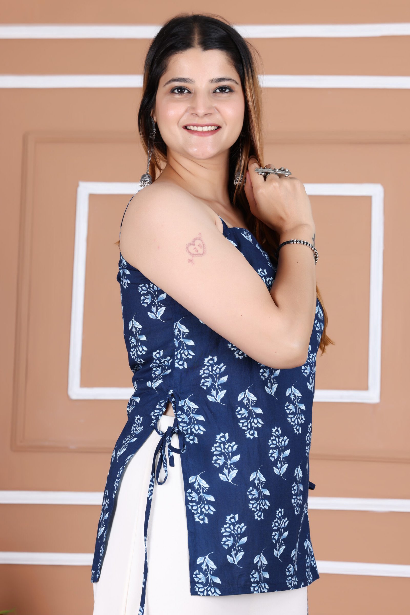Made from breathable cotton fabric, this kurti features an adjustable shoulder strap and side tie-up detail on the seams, giving you a customizable fit that blends modern ease with traditional charm.