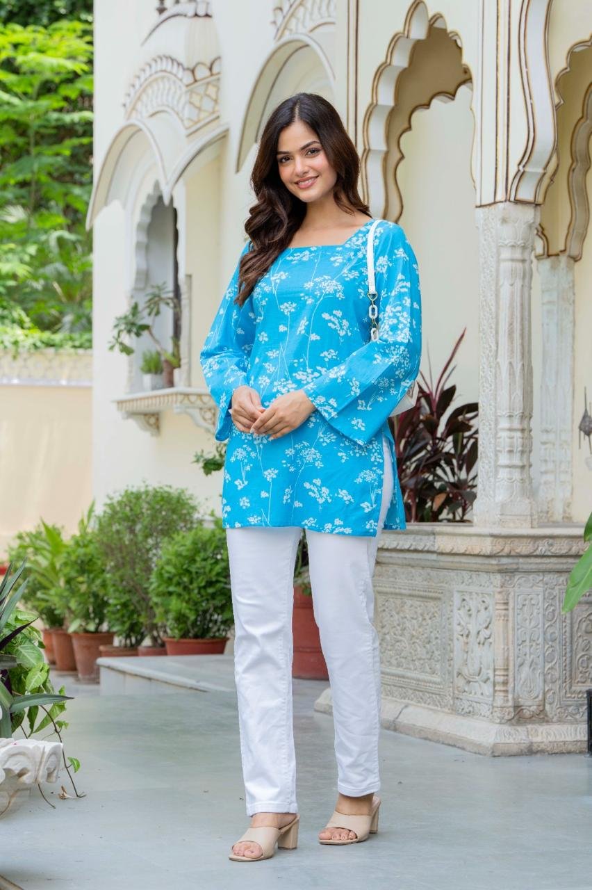 Be the first to review “Sky Blue Floral Printed Cotton Short Kurti with Corset Back”
